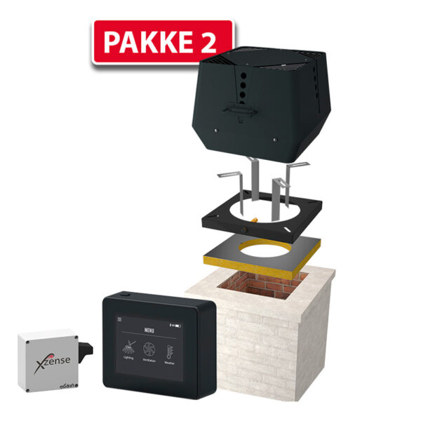 exodraft røgsugerpakkeløsning til pejseindsats eller brændeovn på muret skorsten med afkast under tagryggen.