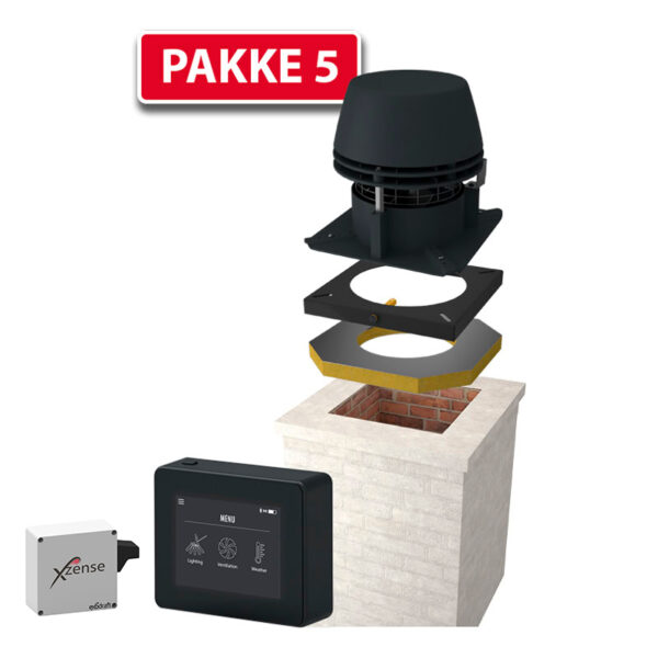 Røgsugerpakke til åben pejs eller 2 ildsteder på muret skorsten, 1 røgkanal med afkast over tagryggen.